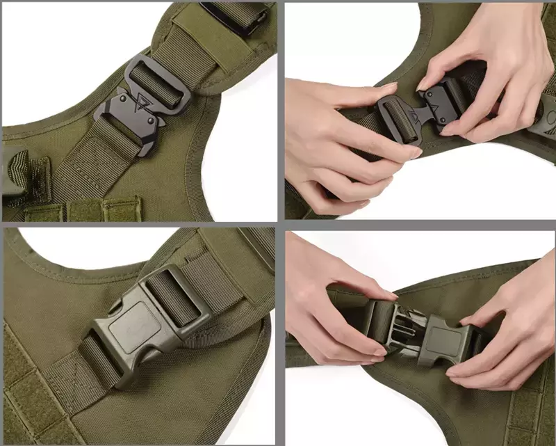 Fabricado com nylon 1000D de alta resistência, o colete possui acolchoamento interno, fivelas de metal reforçadas, pontos de fixação para acessórios MOLLE (tigela, garrafa, brinquedo), além de alças de controle e painéis para personalização com patches ou nome do cão.